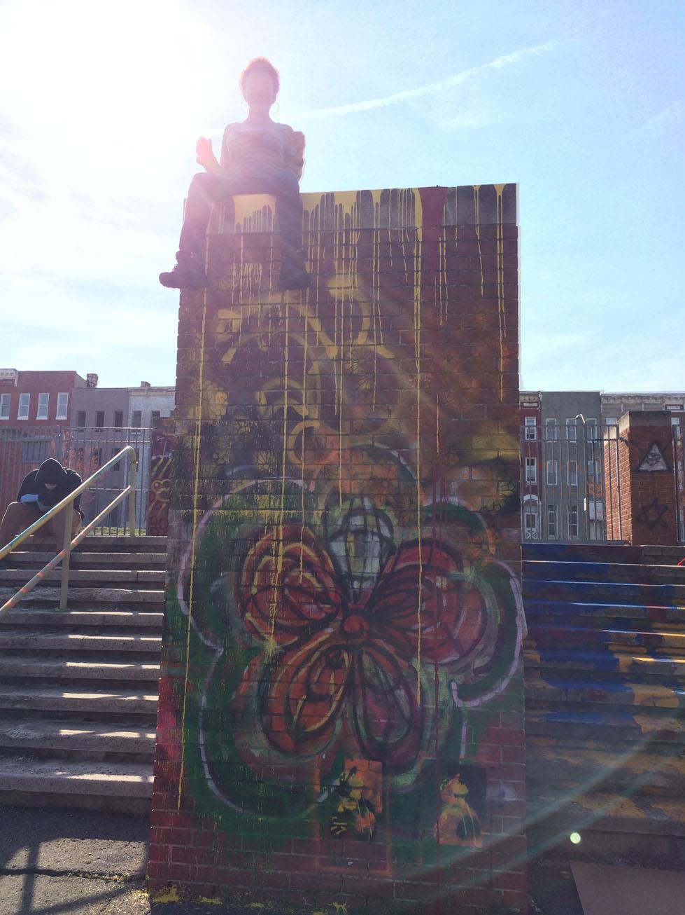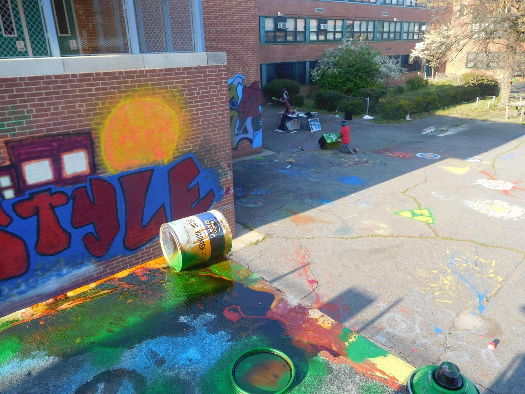 In 2015 Silverstien moved to Baltimore and entered the Master of Fine Arts in Community Arts (MFACA) program of Maryland Institute College of Art (MICA). As an MFACA candidate, simultaneously serving as an AmeriCorps member, she is the 2015-2016 Artist-in-Residence of Augusta Fells Savage Institute of Visual Arts (AFSIVA) high school in West Baltimore. At AFSIVA Silverstien created an afterschool program called the SPACEmakers, where 15 young artists work together to transform public interior and exterior spaces at their school. One of the SPACEmakers’ projects is a sanctioned graffiti space in the school’s courtyard. Her vision for the space includes promotion of safe practices while encouraging big ideas.